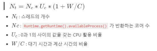 자바 병렬 프로그래밍(Java Concurrency in Practice)에서 스레드 풀의 최적값을 찾는 방법을 제안한다. 스레드 풀이 너무 크면 CPI와 메모리 자원을 서로 경쟁하느라 시간을 낭비할 수 있다. 반면 스레드 풀이 너무 작으면 CPU의 일부 코어는 활용되지 않을 수 있다.