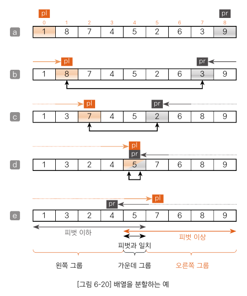 그룹을 나누려면 피벗 이하의 요소를 배열 왼쪽, 피벗 이상의 요소를 배열 오른쪽으로 옮겨야 하므로 다음 작업을 수행합니다.